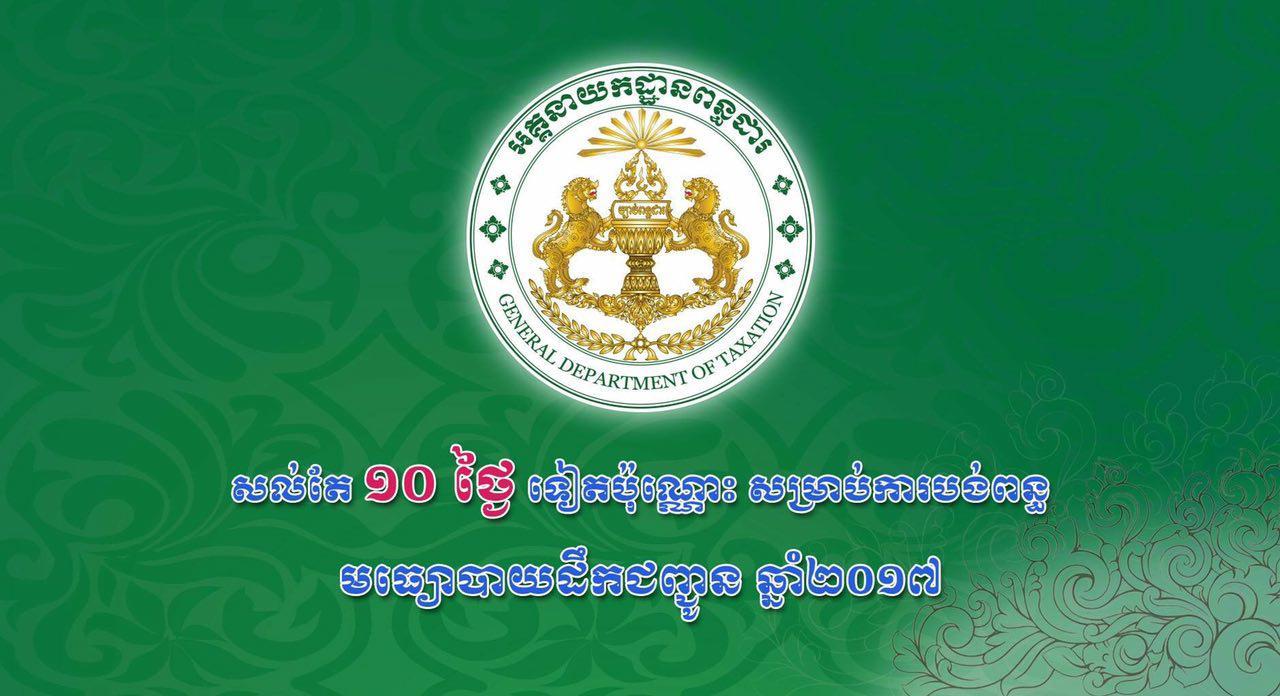 (ភ្នំពេញ)៖ គិតត្រឹមថ្ងៃទី២០ ខែវិច្ឆិកា ឆ្នាំ២០១៧នេះ គឺនៅសល់តែរយៈពេល១០ថ្ងៃទៀតប៉ុណ្ណោះ ការបង់ពន្ធលើមធ្យោបាយដឹកជញ្ជូន ប្រចាំឆ្នាំ២០១៧ នឹងត្រូវបញ្ចប់ ពោលគឺត្រឹមថ្ងៃទី៣០ ខែវិច្ឆិកា ឆ្នាំ២០១៧។