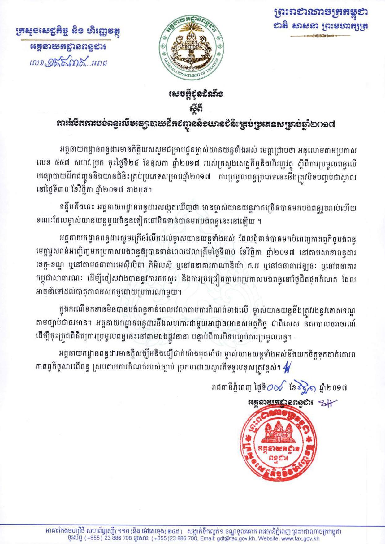 ជាមួយគ្នានេះ កាលពីថ្ងៃទី១០ ខែវិច្ឆិកា ឆ្នាំ២០១៧ អគ្គនាយកដ្ឋានពន្ធដារ បានចេញសេចក្ដីជូនដំណឹងថ្មីមួយ ដោយប្រកាសឱ្យម្ចាស់យានយន្ដទាំងអស់ ដែលមានកាតព្វកិច្ចបង់ពន្ធសម្រាប់ឆ្នាំ២០១៧ រួសរាន់ទៅបង់ពន្ធឲ្យទាន់ពេលវេលា ជៀងវាងរងការផាកពិន័យទ្វេដង។