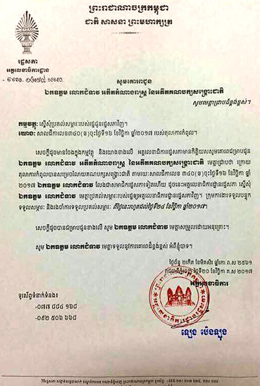 ក្នុងលិខិតរបស់លោក ឡេង ប៉េងឡុង បានបញ្ជាក់ថា «ឯកឧត្តម លោកជំទាវ លែងជាសមាជិករដ្ឋសភាទៀតហើយ ដូចនេះ អគ្គលេខាធិការដ្ឋានរដ្ឋសភា ស្នើសុំឯកឧត្តម លោកជំទាវ មេត្តាប្រគល់សម្ភារៈរបស់រដ្ឋ ឲ្យអគ្គលេខាធិការដ្ឋានរដ្ឋសភាវិញ។ ក្រុមការងារទទួលបន្ទុក ទទួលសម្ភារៈ និងរង់ចាំទទួលប្រគល់សម្ភារៈ ពីថ្ងៃនេះ រហូតដល់ថ្ងៃទី២៤ ខែវិច្ឆិកា ឆ្នាំ២០១៧»