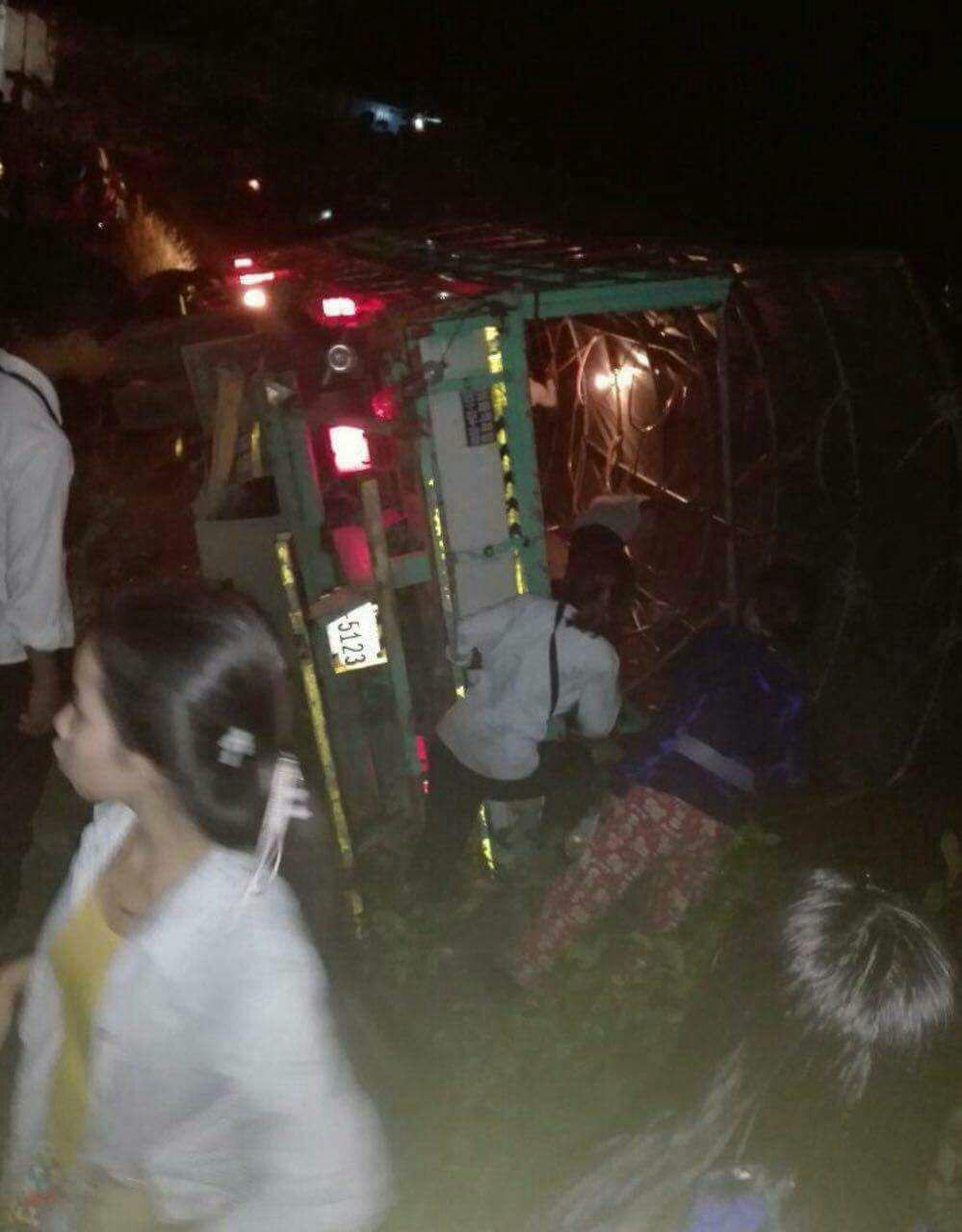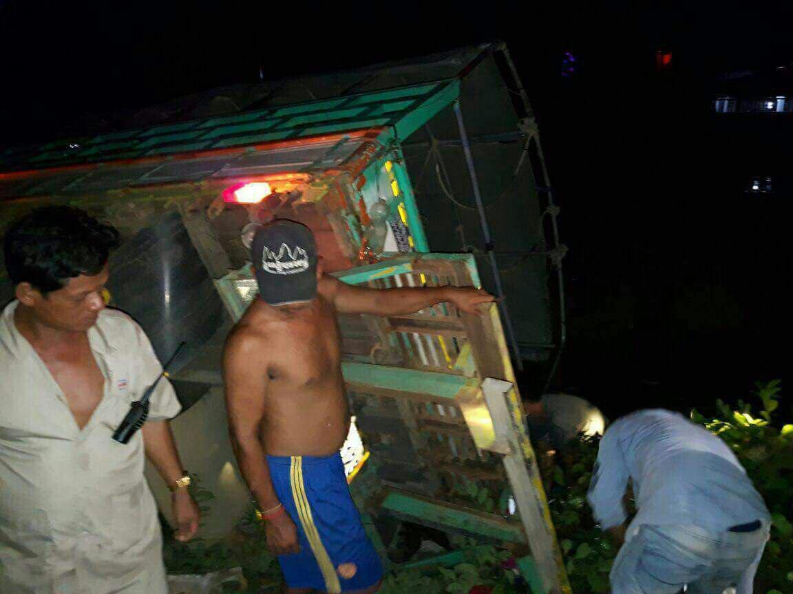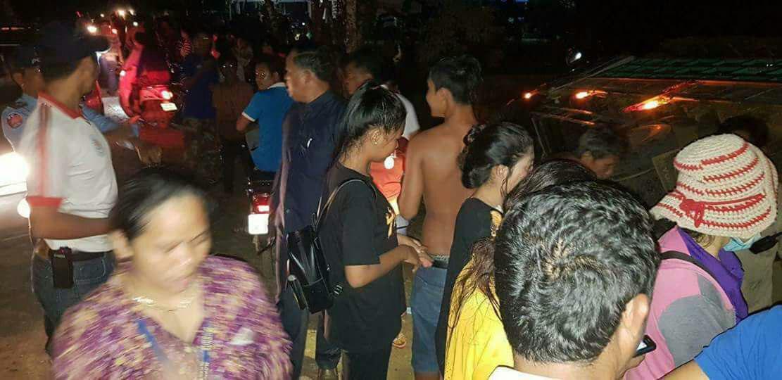ខេត្តតាកែវ៖ រថយន្ត១គ្រឿង ដឹកកម្មករ កម្មការិនី រោងចក្រស្បែកជើង សាន់បូ ជាង១០០នាក់ បានជួបគ្រោះថ្នាក់ចរាចរណ៍ក្រឡាប់ ដោយសារដាច់ហ្វ្រាំង នាវេលាម៉ោង៧យប់ ថ្ងៃទី២១ ខែវិច្ឆិកា ឆ្នាំ២០១៧នេះ នៅភូមិត្រពាំងត្រយឹង ឃុំចំបក់ ស្រុកបាទី បណ្តាលឲ្យរងរបួសជាច្រើនណាស់ ដេករដូករណែលពេញផ្លូវ និងចូលទឹកប្រឡាយ។