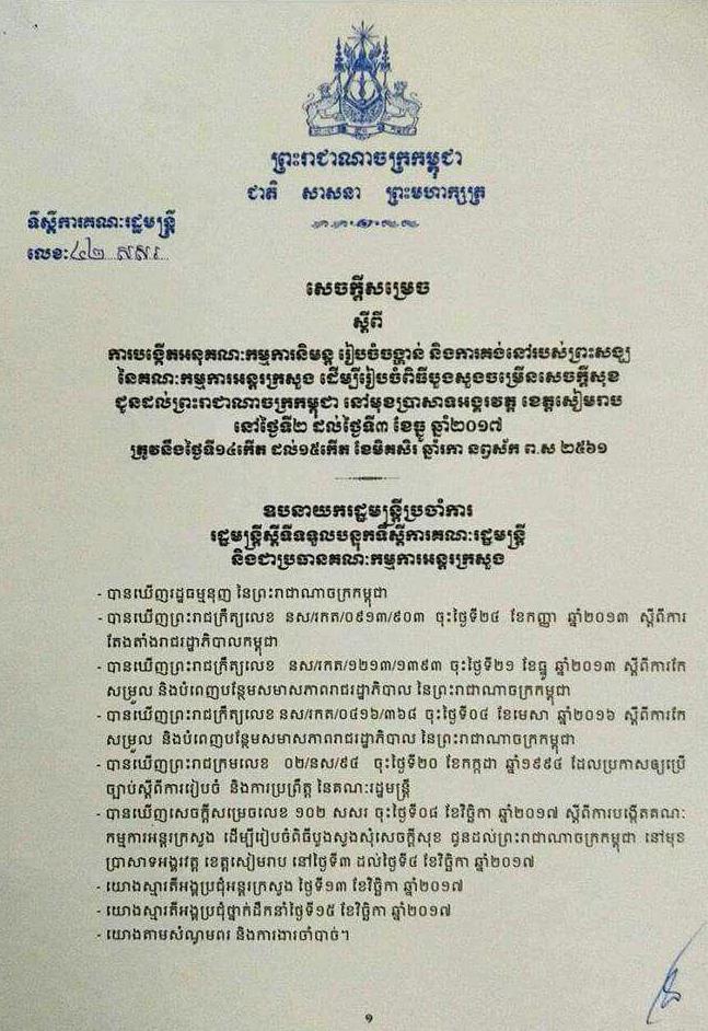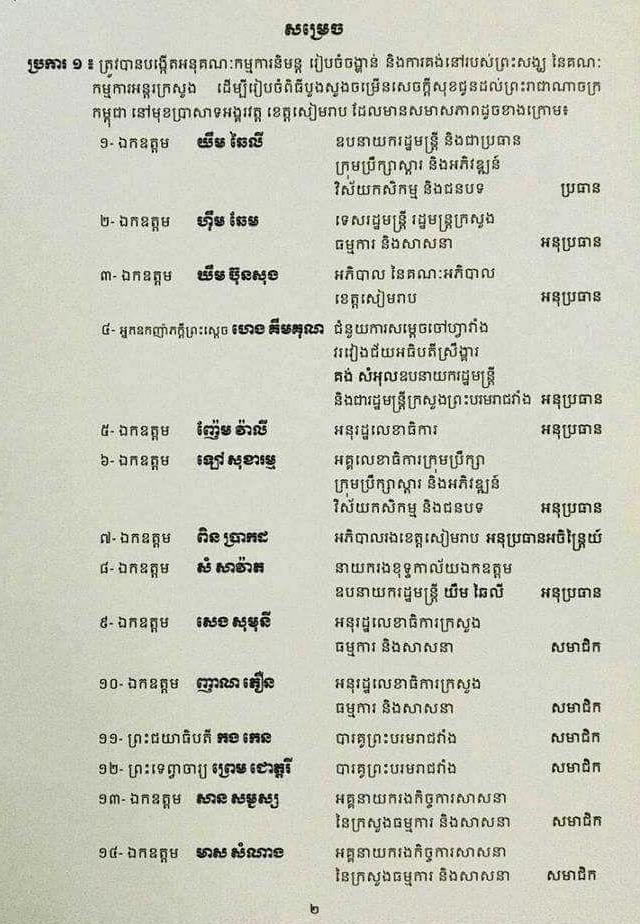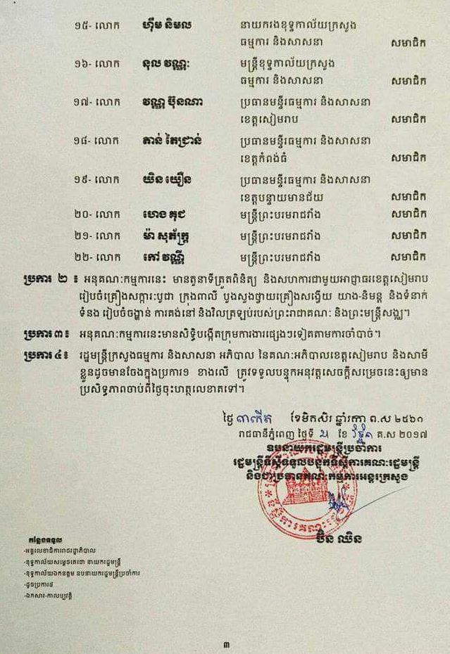 (ភ្នំពេញ)៖ លោកឧបនាយករដ្ឋមន្ត្រីប្រចាំការ ប៊ិន ឈិន រដ្ឋមន្ត្រីស្តីទីទទួលបន្ទុកទីស្តីការគណៈរដ្ឋមន្ត្រី នៅថ្ងៃទី២២ ខែវិច្ឆិកានេះ បានចេញសេចក្តីសម្រេច បង្កើតអនុគណៈកម្មការនិមន្ត រៀបចំចង្ហាន់ និងការគង់នៅរបស់ព្រះសង្ឃ ដើម្បីរៀបចំពិធីបួងសួង ចម្រើនសេចក្តីសុខ ជូនដល់ព្រះរាជាណាចក្រកម្ពុជា នៅមុខប្រាសាទអង្គរវត្ត ខេត្តសៀមរាប នៅថ្ងៃទី០២-០៣ ខែធ្នូ ឆ្នាំ២០១៧។