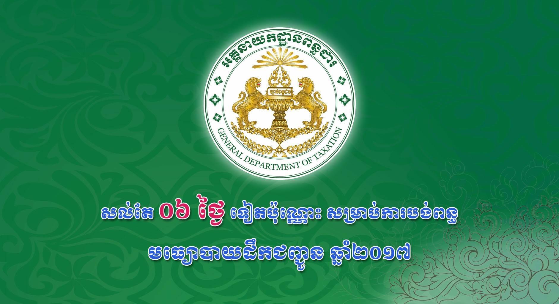 (ភ្នំពេញ)៖ គិតត្រឹមថ្ងៃទី២៤ ខែវិច្ឆិកា ឆ្នាំ២០១៧នេះ គឺនៅសល់តែរយៈពេល៦ថ្ងៃទៀតប៉ុណ្ណោះ ការបង់ពន្ធលើមធ្យោបាយដឹកជញ្ជូន ប្រចាំឆ្នាំ២០១៧ នឹងត្រូវបញ្ចប់ ពោលគឺត្រឹមថ្ងៃទី៣០ ខែវិច្ឆិកា ឆ្នាំ២០១៧។