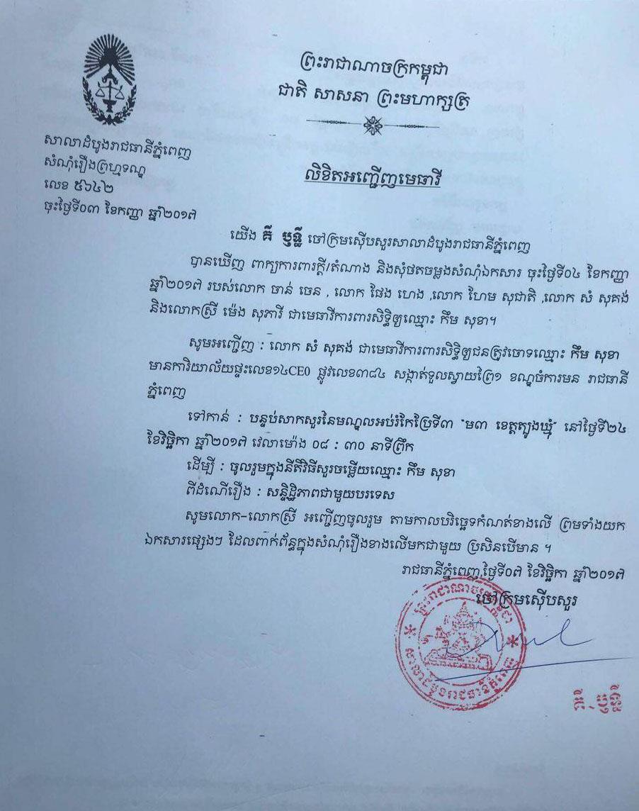 គួរបញ្ជាក់ថា កាលពីថ្ងៃទី០៦ ខែកញ្ញា ឆ្នាំ២០១៧ លោក គី ឫទ្ធី ចៅក្រមស៊ើបសួរ និងជាអនុប្រធានសាលាដំបូងរាជធានីភ្នំពេញ សម្រេចចេញដីកាឃុំខ្លួនលោក កឹម សុខា ប្រធានគណបក្សសង្គ្រោះជាតិ ដាក់ពន្ធនាគារបណ្តោះអាសន្ន ដោយចោទប្រកាន់ពីបទល្មើស «ក្បត់ជាតិ» ដែលអាចប្រឈមមុខនឹងការជាប់ពន្ធនាគារពី១៥ឆ្នាំ ទៅ៣០ឆ្នាំ។ សេចក្តីថ្លែងការណ៍របស់អយ្យការអមសាលាដំបូងរាជធានីភ្នំពេញ បង្ហាញថា លោក កឹម សុខា ជាប់ចោទប្រកាន់ពីបទ «សន្និដ្ឋិភាពជាមួយបរទេស» តាមមាត្រា៤៤៣ នៃក្រមព្រហ្មទណ្ឌ៕