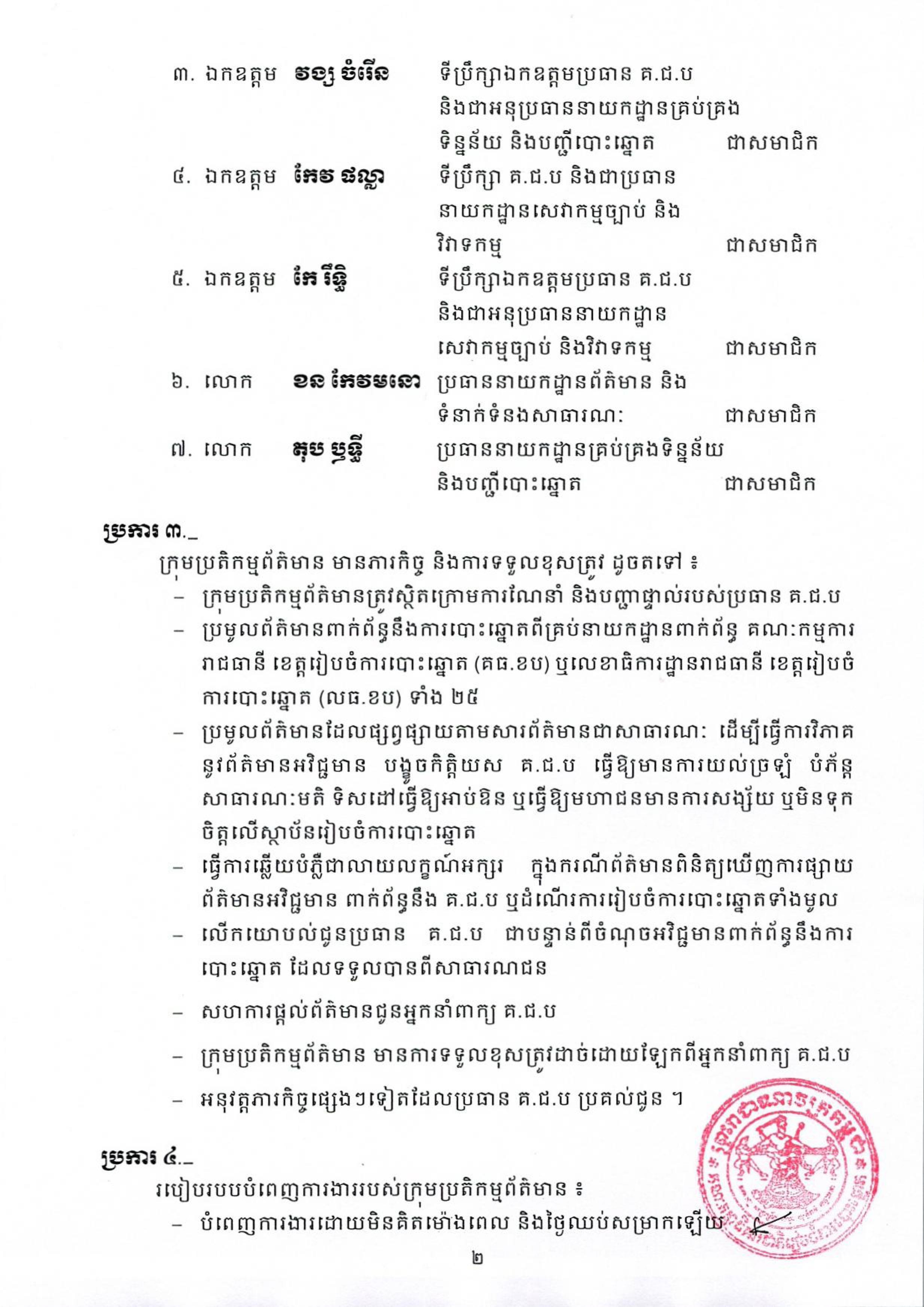 ក្រុមប្រតិកម្មព័ត៌មានរបស់ គ.ជ.ប មានសមាសភាពចំនួន៧រូប ដែលមានលោក សោម សូរីដា អគ្គលេខាធិការរង គ.ជ.ប ជាប្រធាន និង លោក ឡេង សុជា ទីប្រឹក្សាប្រធានគ.ជ.ប ជាអនុប្រធាន ព្រមទាំង៥នាក់ផ្សេងទៀត៕