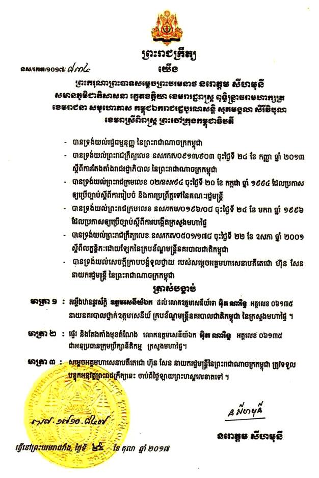 (ភ្នំពេញ)៖ ព្រះករុណា ព្រះបាទបរមនាថ នរោត្តមសីហមុនី ព្រះមហាក្សត្រនៃព្រះរាជាណាចក្រកម្ពុជា បានចេញព្រះរាជក្រឹត្យត្រាស់ បង្គាប់តំឡើង ឧត្តមសេនីយ៍ឯក ដល់លោកឧត្តមសេនីយ៍ទោ អ៊ិត ណារិទ្ធ និងតែងតាំងមុខតំណែង ជាអនុប្រធានក្រុមប្រឹក្សានីតិកម្ម ក្រសួងមហាផ្ទៃ។