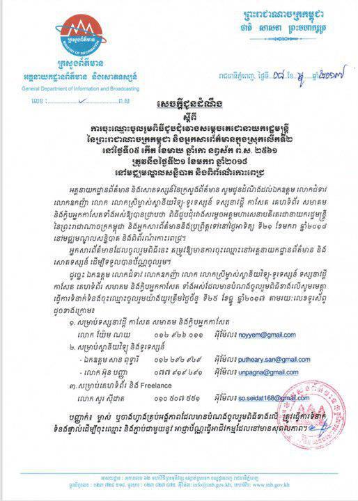 ទី២៖ សម្រាប់ស្ថានីយ៍វិទ្យុ និងទូរទស្សន៍ សូមទាក់ទង លោក សាន ពុទ្ធារី ០១២ ២៩២​ ៩៤៩, លោក អ៊ុន បញ្ញា ០៧៧ ៩១៩ ៤៩១