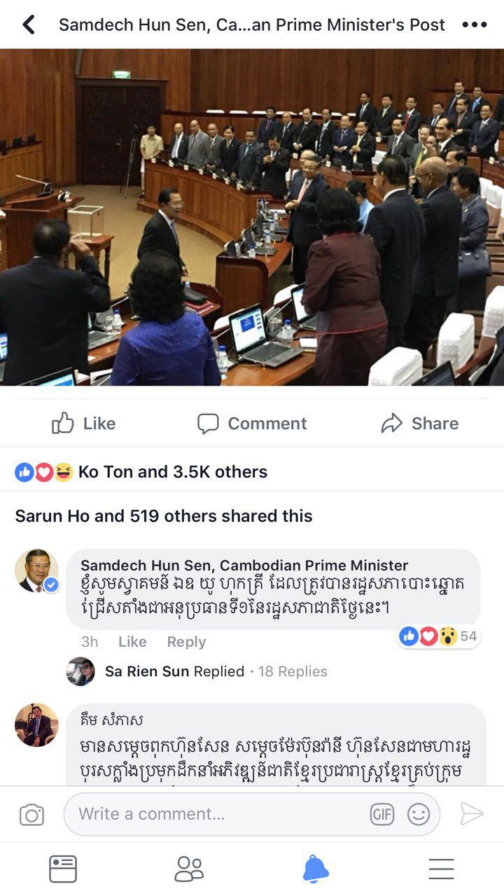 ជាមួយនឹងការបង្ហាញវត្តមាន អនុប្រធានទី១ថ្មីនេះ សម្តេចតេជោ ហ៊ុន សែន នាយករដ្ឋមន្ត្រីនៃកម្ពុជា បាន Comment នៅលើ Facebook ផ្លូវការរបស់សម្តេចថា «ខ្ញុំសូមស្វាគមន៍ ឯកឧត្តម យូ ហុកគ្រី ដែលបានរដ្ឋសភាបោះឆ្នោត ជ្រើសតាំងជាអនុប្រធានទី១ នៃរដ្ឋសភាជាតិថ្ងៃនេះ»។