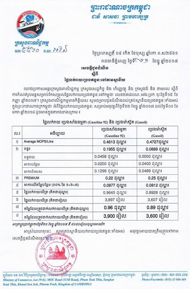 (ភ្នំពេញ)៖ ក្រសួងពាណិជ្ជកម្ម បានចេញសេចក្ដីជូនដំណឹង ស្ដីពីការកំណត់ ថ្លៃលក់រាយប្រេងឥន្ធនៈ នៅតាមស្ថានីយ ដោយតម្លៃសាំងធម្មតាថ្លៃ៣,៩០០រៀលក្នុង១លីត្រ និងម៉ាស៊ូតថ្លៃ៣,៦០០រៀលក្នុង១លីត្រ ដែលតម្លៃនេះចាប់អនុវត្តន៍ពីថ្ងៃទី២២ ខែធ្នូ ឆ្នាំ២០១៧ ដល់ថ្ងៃទី០១ ខែមករា ឆ្នាំ២០១៨៕