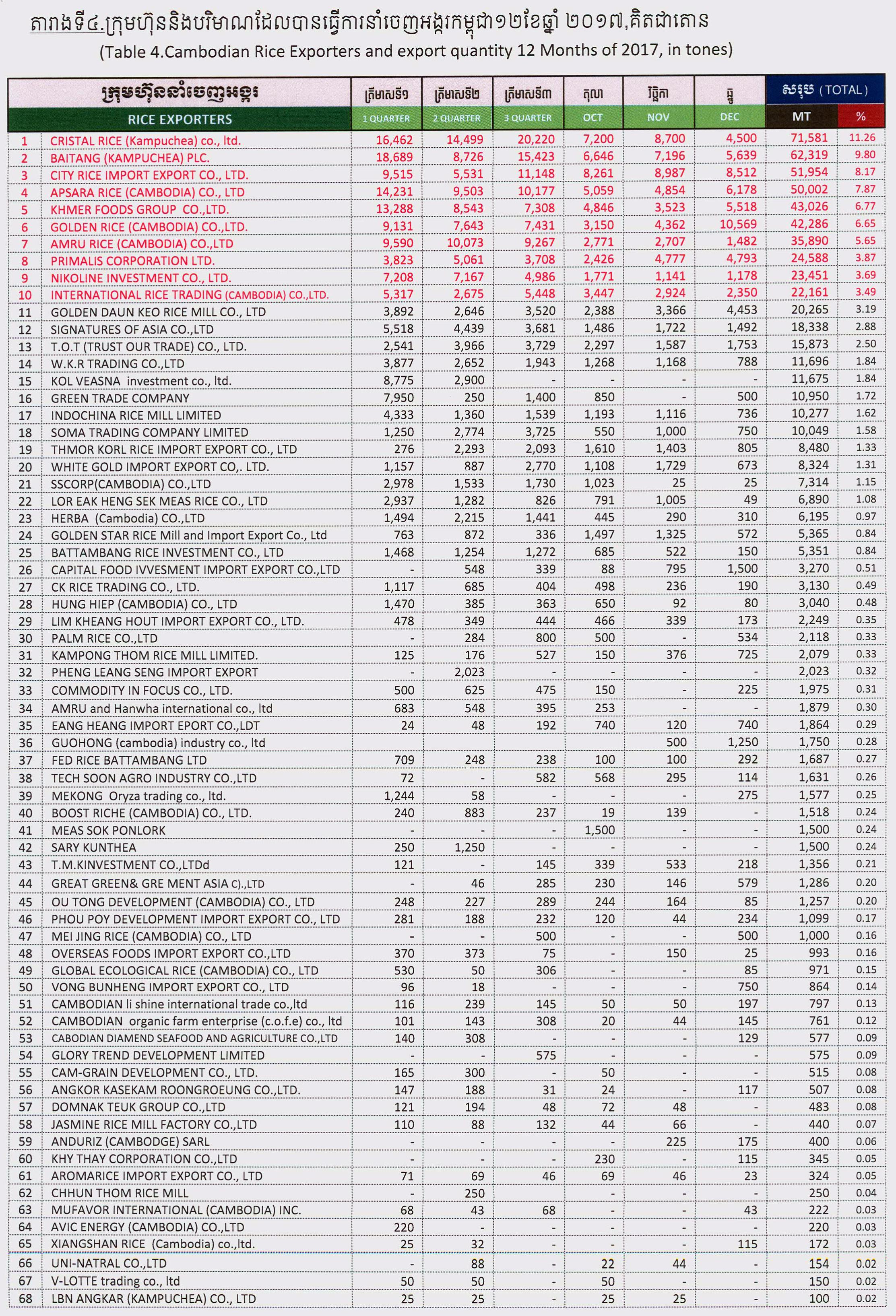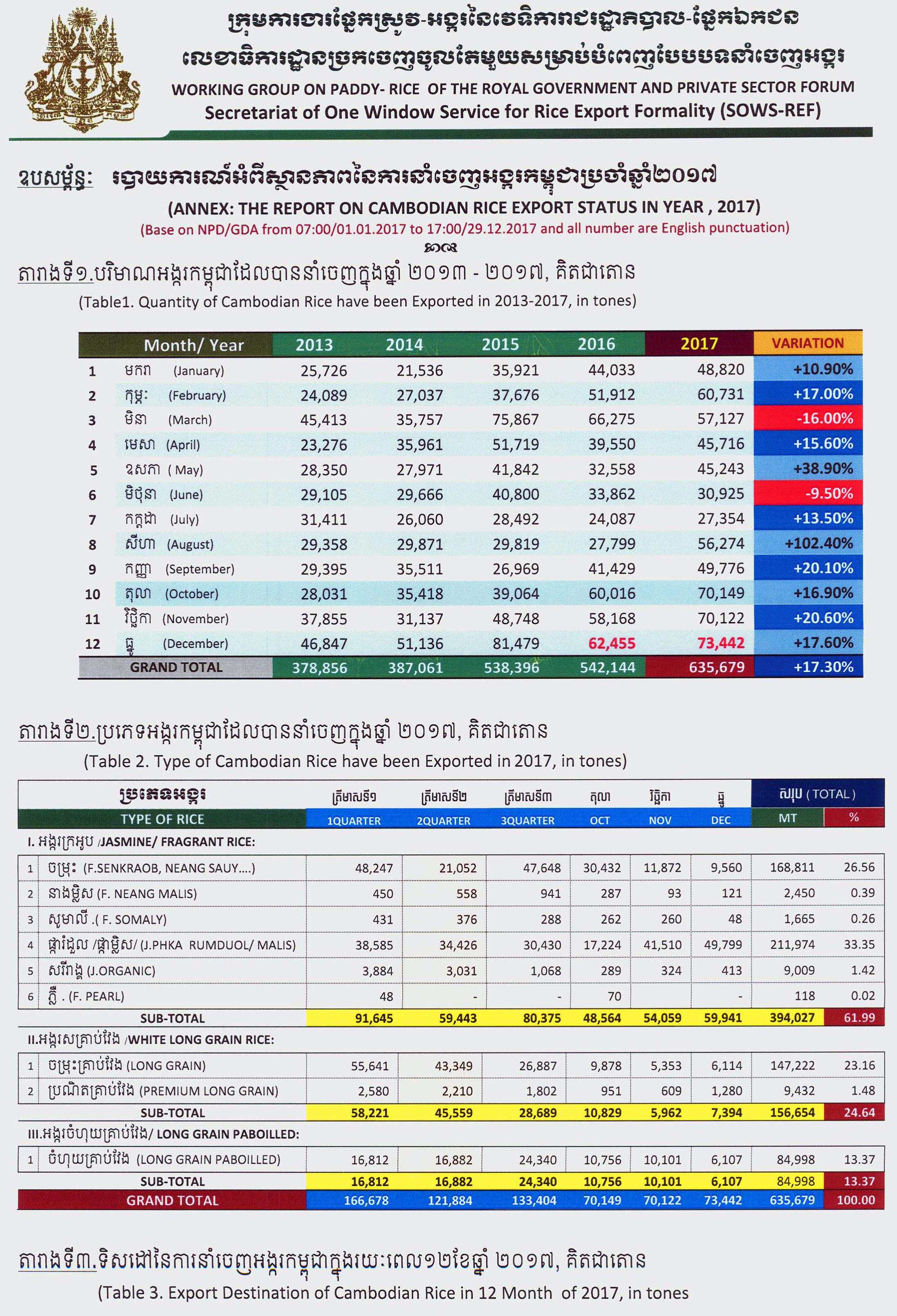 (ភ្នំពេញ)៖ នៅឆ្នាំ២០១៧ អង្កររបស់កម្ពុជាយើងបាននាំទៅកាន់៦០ប្រទេស នៅលើពិភពលោក ស្មើនឹងចំនួនសរុបជាង៦៣ម៉ឺនតោន កើនឡើង១៧.៣ភាគរយបើធៀបនឹងឆ្នាំ២០១៦ មានត្រឹមតែជាង៥៤ម៉ឺនតោនប៉ុណ្ណោះ។ នេះបើតាមទិន្នន័យផ្លូវការ ដែលទទួលបានពីលេខាធិការដ្ឋាន ច្រកចេញចូលតែមួយ សម្រាប់បំពេញបែបបទនាំចេញអង្ករ។