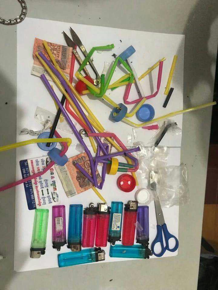 បន្ទាប់ពីឃាត់ខ្លួនបានសមត្ថកិច្ចរកឃើញ ដាវចំនួន១ សម្ភារ:ជក់ និងវេចខ្ចប់សម្រាប់ជួញដូរមួយចំនួនទៀត! នៅខាងក្រោយបន្ទប់លេខ០៤ ក្នុងបរិវេណផ្ទះសំណាក់ ដែលជនត្រូវចោទជួលស្នាក់នៅ។