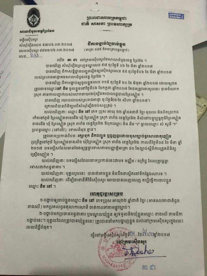 លោកបន្តថា ក្រោយពេលឃាត់ខ្លួនជនខាងលើយកមកសួរនាំ ឃើញថាជននេះមានដីការបង្គាប់ឲ្យចាប់ខ្លួនរបស់លោក ជា ភា ចៅក្រមស៊ើបសួរនៃសាលាដំបូងខេត្តព្រៃវែង។