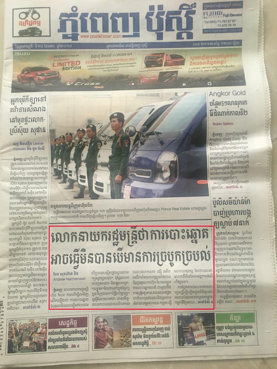 សម្ដេចតេជោ ហ៊ុន សែន ប្រតិកម្មយ៉ាងខ្លាំងនូវការចេញផ្សាយរបស់កាសែតភ្នំពេញប៉ុស្ដិ៍ ដែលថាការបោះឆ្នោតនឹងមិនអាចធ្វើទៅបាន បើមានភាពច្របូកច្របល់