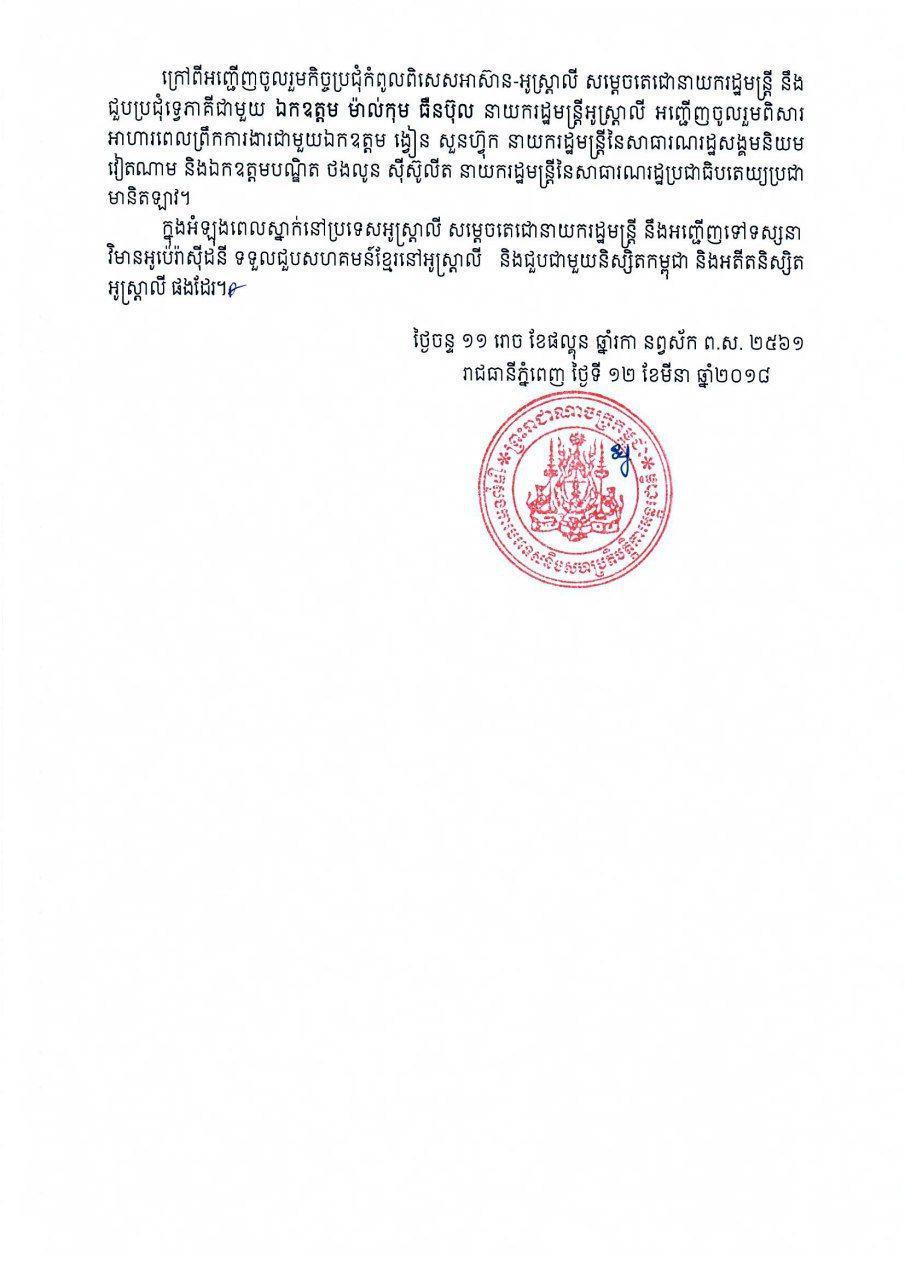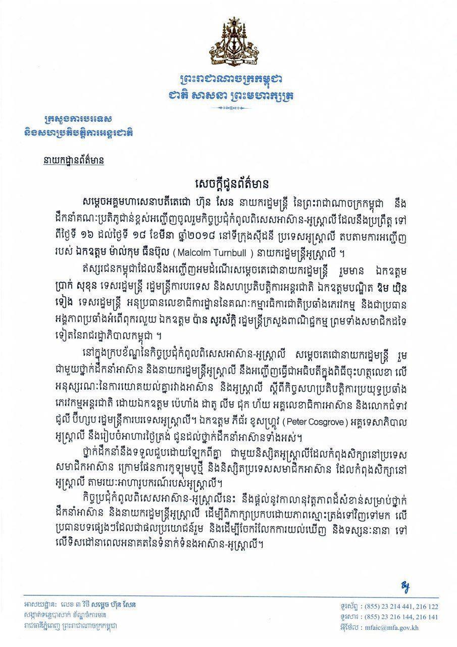 ភ្នំពេញ៖ថ្ងៃទី១៦ ដល់ថ្ងៃទី១៨ ខែមីនា ឆ្នាំ២០១៨ខាងមុខនេះ សម្តេចតេជោ ហ៊ុន សែន នាយករដ្ឋមន្រ្តីនៃកម្ពុជា នឹងដឹកនាំគណៈប្រតិភូជាន់ខ្ពស់ អញ្ជើញចូលរួមកិច្ចប្រជុំកំពូលពិសេសអាស៊ាន-អូស្រា្តលី ដែលនឹងប្រព្រឹត្តទៅនៅទីក្រុងស៊ីដនី ប្រទេសអូស្រ្តាលី តបតាមការអញ្ជើញរបស់ លោក ម៉ាល់កុម ធឺនប៊ុល (Malcolm Turnbull) នាយករដ្ឋមន្រ្តីអូស្រា្តលី។