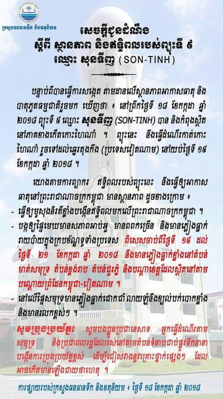 ក្រសួងធនធានទឹក និងឧតុនិយម ប្រកាសអោយប្រជានេសាទ អ្នកដំណើរតាមសមុទ្រ និងប្រជាពលរដ្ឋរស់នៅតាមដំបន់ទំនាបជាប់ផ្លូវទឹកនានាបង្កើនការប្រុងប្រយ័ត្នខ្ពស់ ដើម្បីជៀសវាងនូវគ្រោះថ្នាក់ផ្សេងៗ ដែលអាចកើតមានឡើងជាយថាហេតុ ចាប់ពីថ្ងៃ១៩ ដល់ ២១ខែកក្កដា ឆ្នាំ២០១៨!