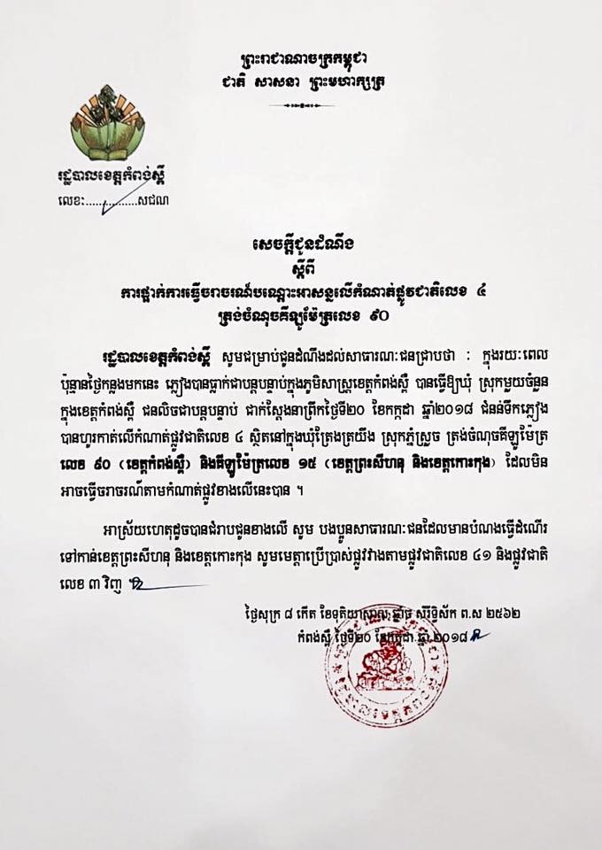 (កំពង់ស្ពឺ)៖ រដ្ឋបាលខេត្តកំពង់ស្ពឺនៅព្រឹកថ្ងៃទី២០ ខែកក្កដា ឆ្នាំ២០១៨ បានចេញសេចក្តីជូនដំណឹង ស្ដីពីការផ្អាកការធ្វើចរាចរណ៍ បណ្ដោះអាសន្នលើកំណាត់ផ្លូវជាតិលេខ ៤ ត្រង់ចំណុចគីឡូម៉ែត្រលេខ ៩០!