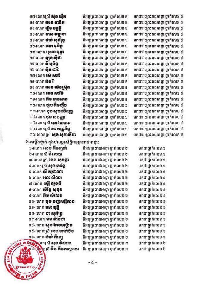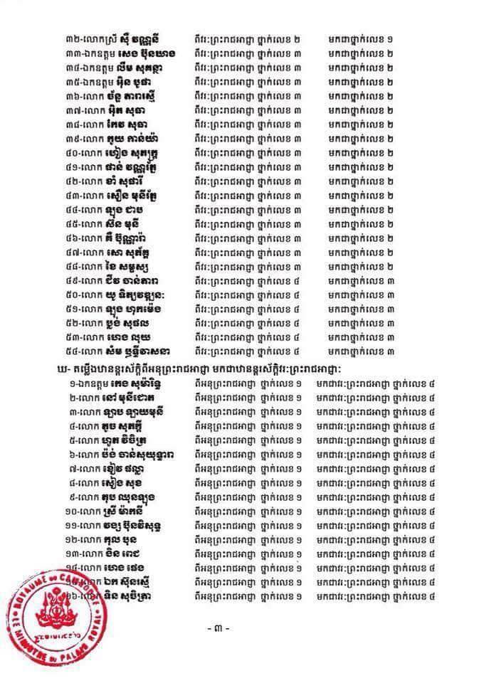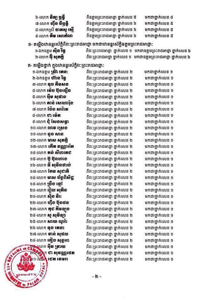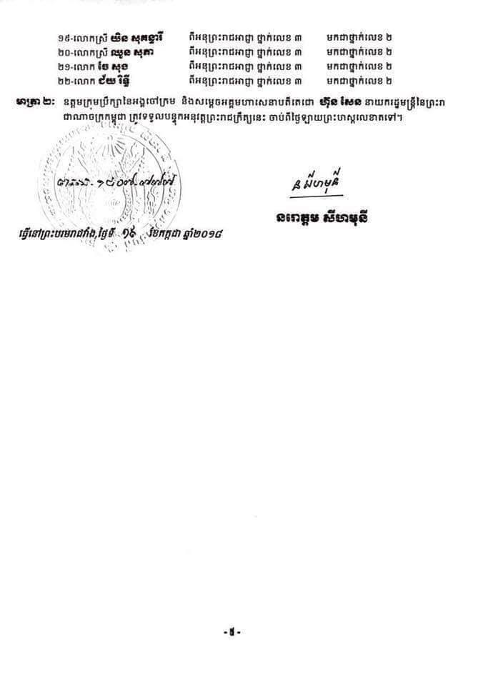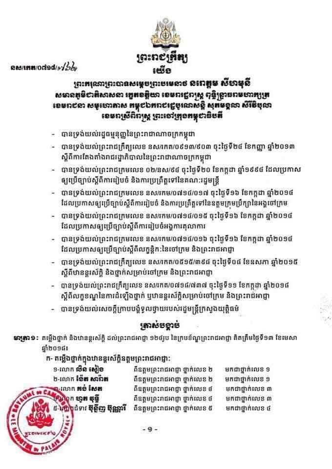 (រាជធានីភ្នំពេញ)៖ ព្រះករុណាព្រះបាទសម្តេចព្រះបរមនាថ នរោត្តម សីហមុនី ព្រះមហាក្សត្រនៃព្រះរាជាណាចក្រកម្ពុជា បានចេញព្រះរាជក្រឹត្យតម្លើងថ្នាក់ និងឋានន្តរស័ក្តិដល់ព្រះរាជអាជ្ញា ១២៤រូប គិតត្រឹមថ្ងៃទី១៣ ខែមេសា ឆ្នាំ២០១៨