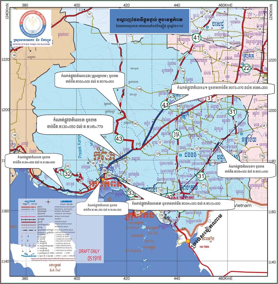 (កំពត)៖ កំណាត់ផ្លូវជាតិលេខ៣ ប្រវែង១៥គម ដែលរងការខូចខាតដោយជំនន់ទឹកភ្លៀង នឹងត្រូវជួសជុលអោយហើយ បណ្តោះអាសន្នក្នុងរយៈពេល ១សប្តាហ៍ ។ នេះបើតាមការបញ្ជាក់របស់លោកទេសរដ្ឋមន្រ្តី ស៊ុន ចាន់ថុល រដ្ឋមន្រ្តីក្រសួងសាធារណៈការ និងដឹកជញ្ជូន នាព្រឹកថ្ងៃទី២០ ខែកក្កដា ឆ្នាំ២០១៨នេះ ខណៈពេលដែលលោកដឹកនាំមន្រ្តីក្រសួង រួមនឹងអភិបាលខេត្តកំពត បានអញ្ជើញចុះពិនិត្យមើលស្ថានភាពផ្លូវជាតិលេខ៣ និងផ្លូវជាតិលេខ៣៣ ដែលរងការខូចខាតដោយសារជំនន់ទឹកភ្លៀង ។