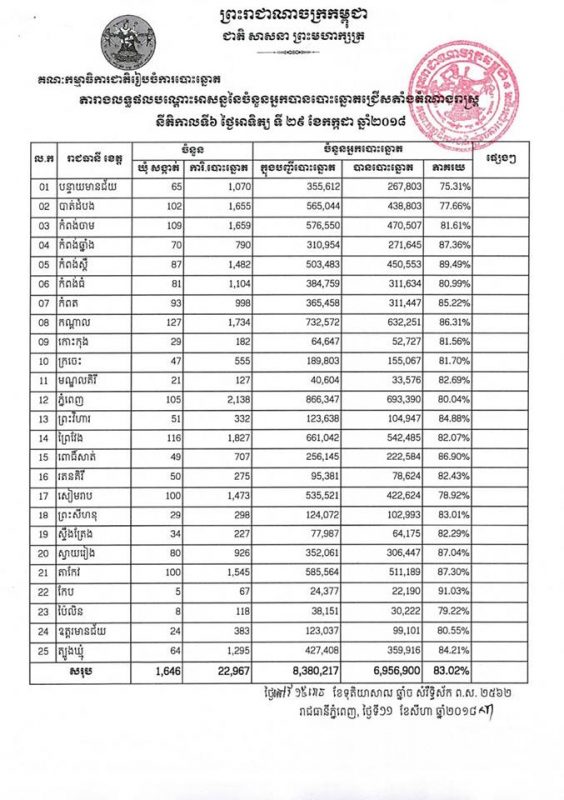 (ភ្នំពេញ)៖ ទីបំផុតចំនួនអ្នកចេញទៅបោះឆ្នោតជ្រើសតាំងតំណាងរាស្រ្តនីតិកាលទី៦ កាលពីថ្ងៃអាទិត្យ ទី២៩ ខែកក្កដា ឆ្នាំ២០១៨កន្លងទៅនេះមានដល់ទៅ ៨៣.០២%ឯណោះ បន្ទាប់ពីគជបបានធ្វើការផ្ទៀងផ្ទាត់សន្លឹកឆ្នោតគ្រប់ដំណាក់កាល នេះបើតាមការប្រកាសអោយដឹងពី គណៈកម្មាធិការជាតិរៀបចំការបោះឆ្នោត នៅព្រឹកថ្ងៃសៅរ៍ ទី១១ ខែសីហា ឆ្នាំ២០១៨នេះ ។