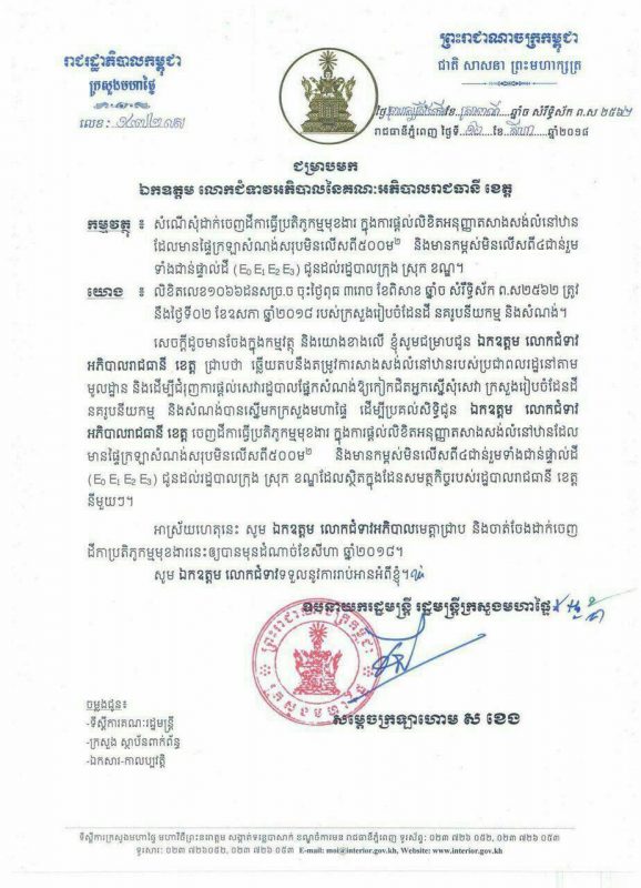 (ភ្នំពេញ)៖ រាជរដ្ឋាភិបាលកម្ពុជាដែលមានក្រសួងមហាផ្ទៃជាសេនាធិការបានសំរេចអនុញ្ញាតអោយរដ្ឋបាលក្រុង ស្រុក ខណ្ឌ មានសិទ្ធិចេញលិខិតអនុញ្ញាត អោយសាងសង់លំនៅឋានដែលមានផ្ទៃក្រឡាសរុបមិនលើសពី ៥០០ម៉ែត្រការ៉េ និងមានកម្ពស់មិនលើសពី ៤ជាន់រួមទាំងជាន់ផ្ទាល់ដី (E0 E1 E2 E3) ក្នុងដែនសមត្ថកិច្ចរបស់រដ្ឋបាលរាជធានី ខេត្តនីមួយៗ ។