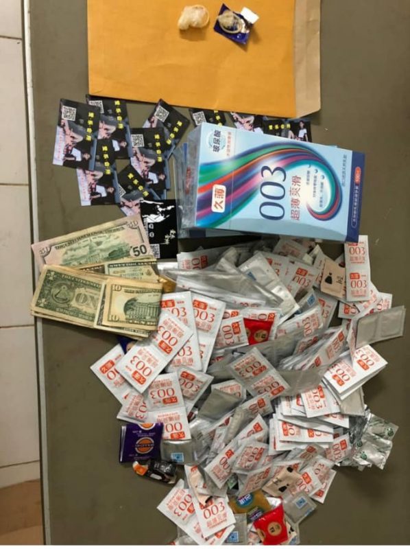 វត្ថតាង និងសម្ភារ: ដកហូតរួមមាន៖ ១.ស្រោមអនាម័យប្រើប្រាស់រួចចំនួន ២ ។ ២.ស្រោមអនាម័យមិនទាន់ប្រើប្រាស់រួច មួយចំនួនធុះ ។ ៣.ប្រាក់ដុល្លាចំនួន ២៥០$ ។ ៤.ទូរស័ព្ទដៃ ចំនួន ៥ គ្រឿង ។ ៥.រថយន្ដ ចំនួន ១ គ្រឿង ម៉ាកHIGHLANDER ។