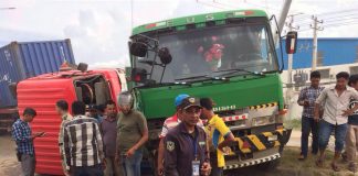 រថយន្តដឹកកុងតឺន័រម៉ាក HINO ក្រឡាប់ដាច់ក្បាលធ្លាក់មកលើដីច្រង៉ាងបន្ទាប់ពីបើកបុកពីក្រោយរថយន្តMITSUBISHI