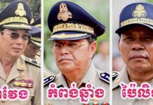 (ភ្នំពេញ)៖ ស្នងការនគរបាលខេត្តព្រៃវែង លោកឧត្តមសេនីយ៍ទោ ស្រេង ជា - ស្នងការនគរបាលខេត្តកំពង់ឆ្នាំង លោកឧត្តមសេនីយ៍ទោ ឡុច វណ្ណារ៉ា និង ស្នងការនគរបាលខេត្តប៉ៃលិន លោកឧត្តមសេនីយ៍ទោ ជា ចាន់ឌិន រួមនិងនាយនគរបាលថ្ន...